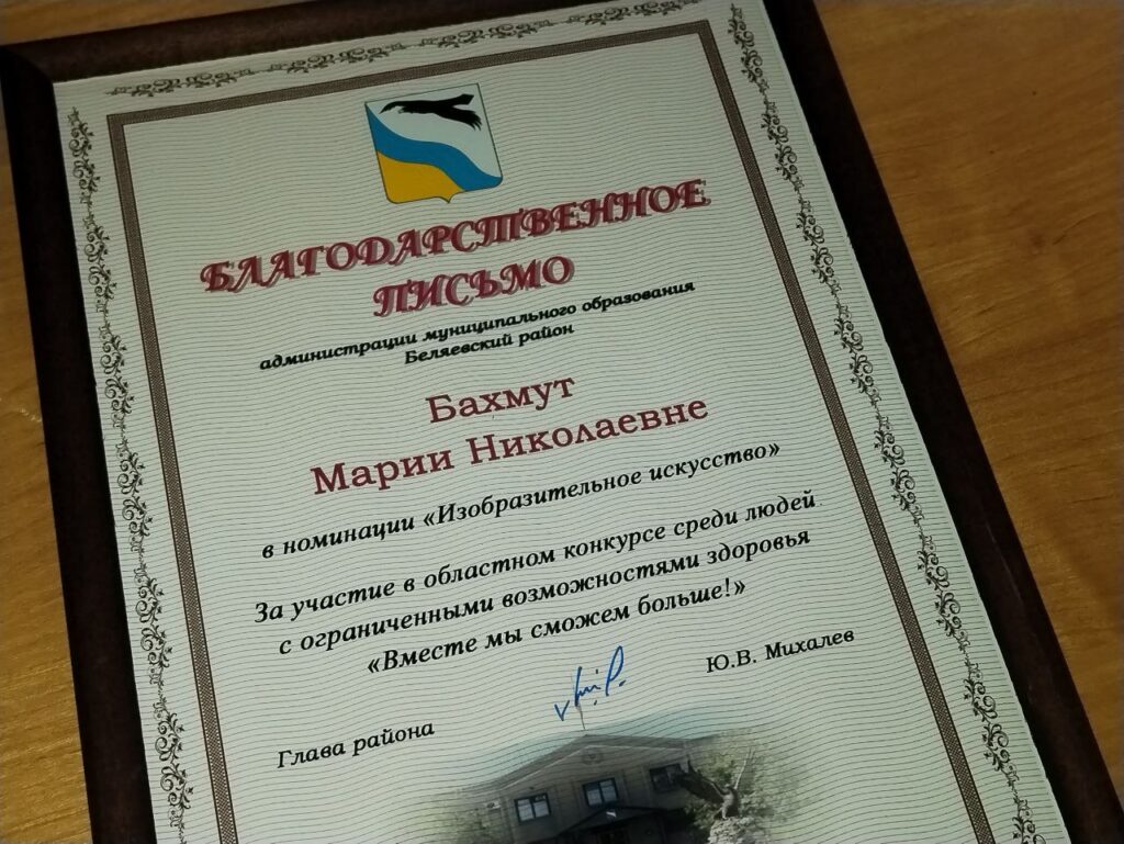 Лариса Николаевна вручила благодарственные письма администрации Беляевского района талантливым участникам областного конкурса «Вместе мы сможем больше!». Среди награжденных: Надежда Вигонд (хореография), Татьяна Ичетовкина (декоративно-прикладное искусство) и Мария Бахмут (изобразительное искусство).